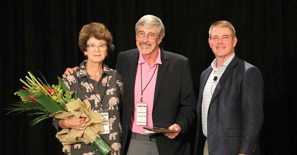 Tony Vuksich, center, flanked by his wife, Anita, receives the Bronson J. Lewis Award from APA Board Chairman Roy O. Martin III.