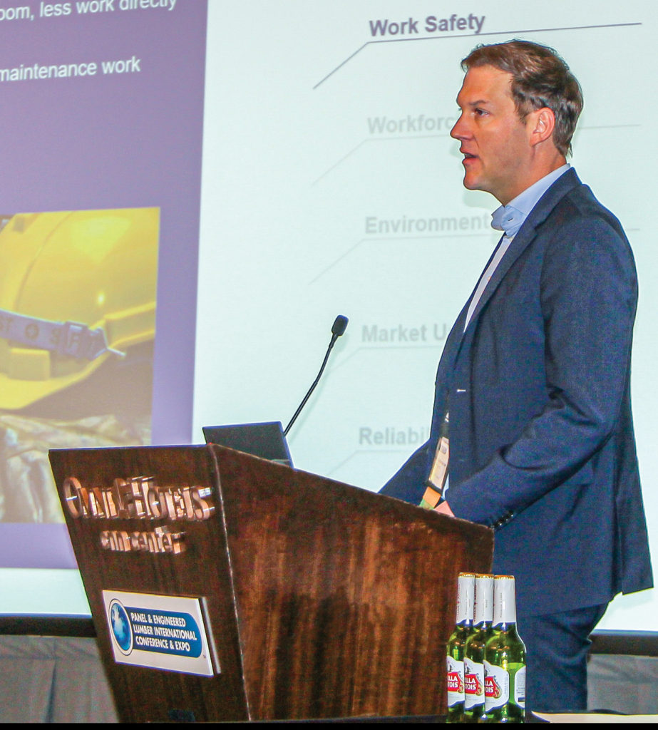 Continuing the theme of history, culture, digitalization and sustainability was Christian Dieffenbacher, CEO of Germany-based Dieffenbacher, with his talk “Future Oriented by Tradition.” The company, which is a major supplier to the new Martco OSB plant, turned 150 years old last year and has had a major presence in North America for more than 40 years, first with a production site in Canada and since 2012 with a subsidiary in Georgia. It remains family-owned and employs 1,850 worldwide, while serving four markets: wood-based panels, forming, recycling and energy.
