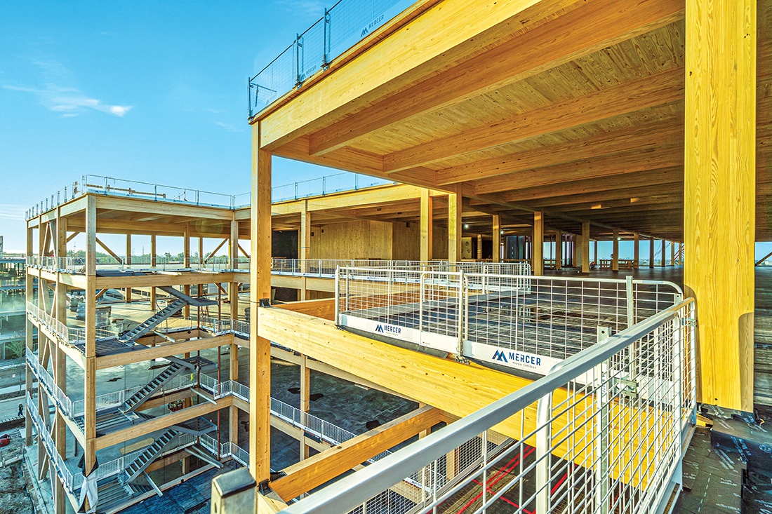 Mercer Mass Timber (MMT), a manufacturer of timber building materials and a subsidiary of Mercer International Inc., has announced the completion of a key role in the construction of Walmart’s new Home Office in Bentonville, Ark.—the largest mass timber corporate campus in the U.S. The installation of Mercer mass timber panels began in spring 2024 and is now complete.